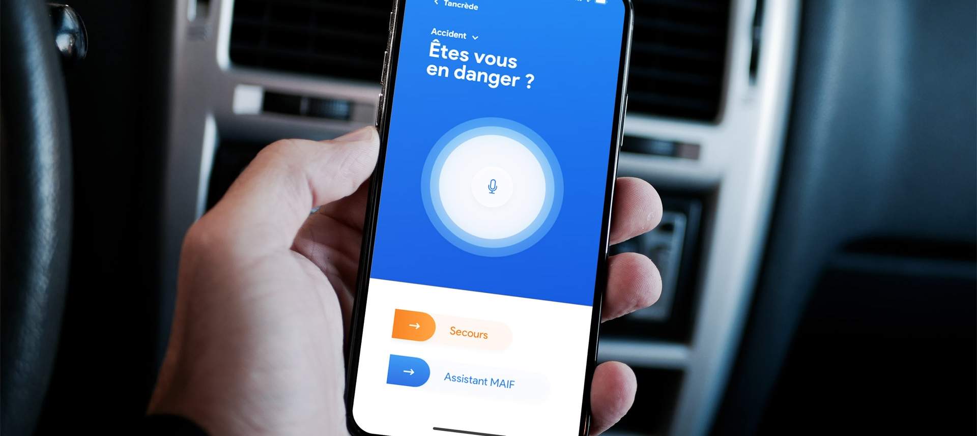 Tancrède is aimed at MAIF customers who are road users and want to be taken care of quickly in the event of an accident. Tancrède is both a mobile application and/or a stand-alone smart box. The voice assistant includes simple instructions and informs the user about the conditions of his breakdown. It can also contact the emergency services after detecting an accident.