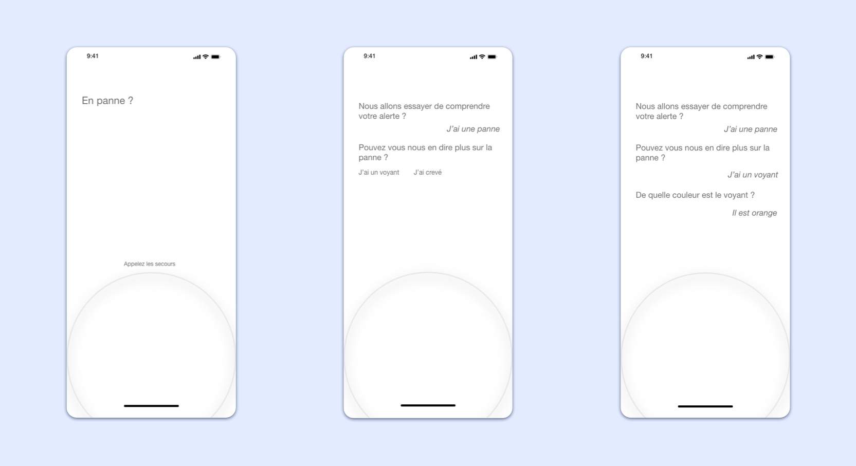 After any type of accident, the victim is potentially in a state of shock. Channeling this state is a challenge that a voice assistant could take up by explaining the situation in a rational way. It was, therefore, important to determine the interactions that would be useful for the proper functioning of the Tancrède application, to determine the tone of the assistant and the simplicity of the interfaces.